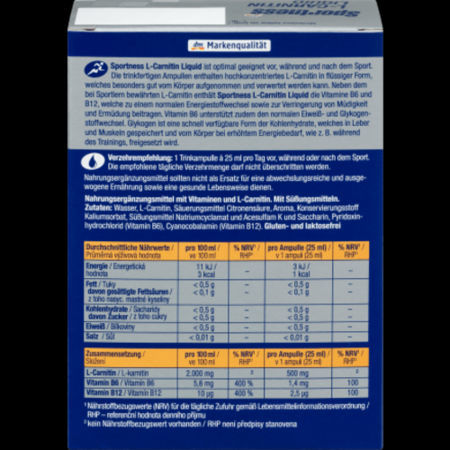 Sportness L-Carnitine Liquid est idéal avant, pendant et après l'exercice. Les ampoules prêtes à boire contiennent de la L-carnitine hautement concentrée sous forme liquide, particulièrement facile à absorber et à utiliser par le corps. En plus de la L-Carnitine, qui a été éprouvée par les athlètes, L-Carnitine Liquid contient des vitamines B6 et B12, qui contribuent à un métabolisme énergétique normal et à la réduction de la fatigue et de la fatigue. La vitamine B6 soutient également le métabolisme normal des protéines et du glycogène.